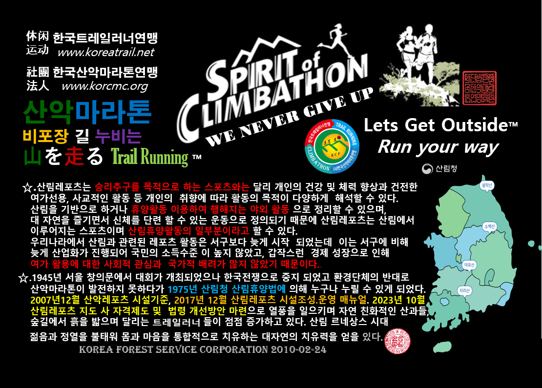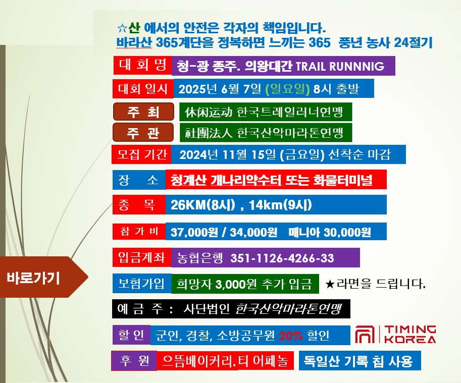 참고로 트레일런 홈페이지들의 소개 페이지들의 디자인은 매우,,, 멋지다! 아래는 올해 6월 7일에 열리는 제 8회 청-광 종주 의왕대간 Trail Running 사이트의 소개 문구들이다.