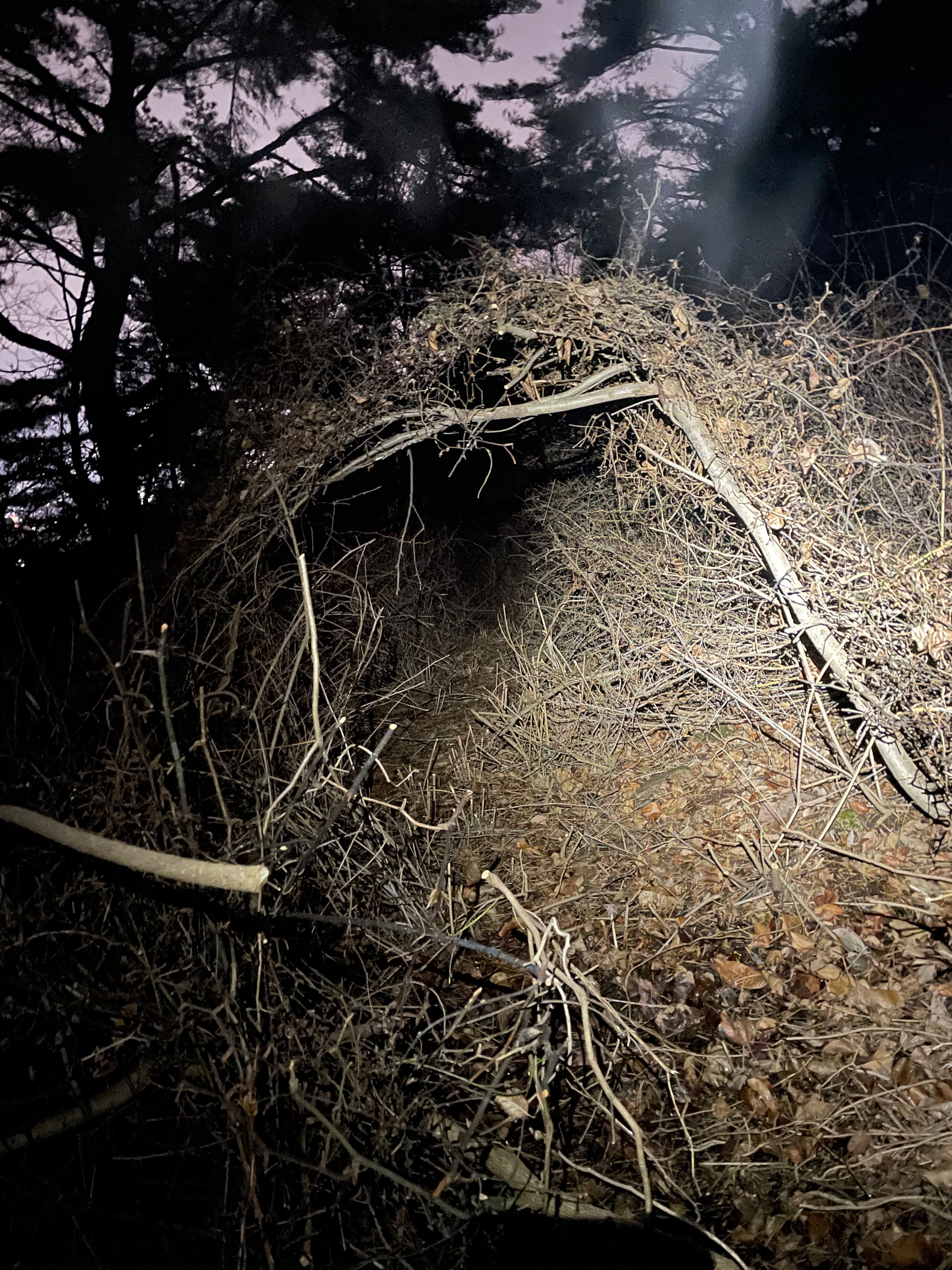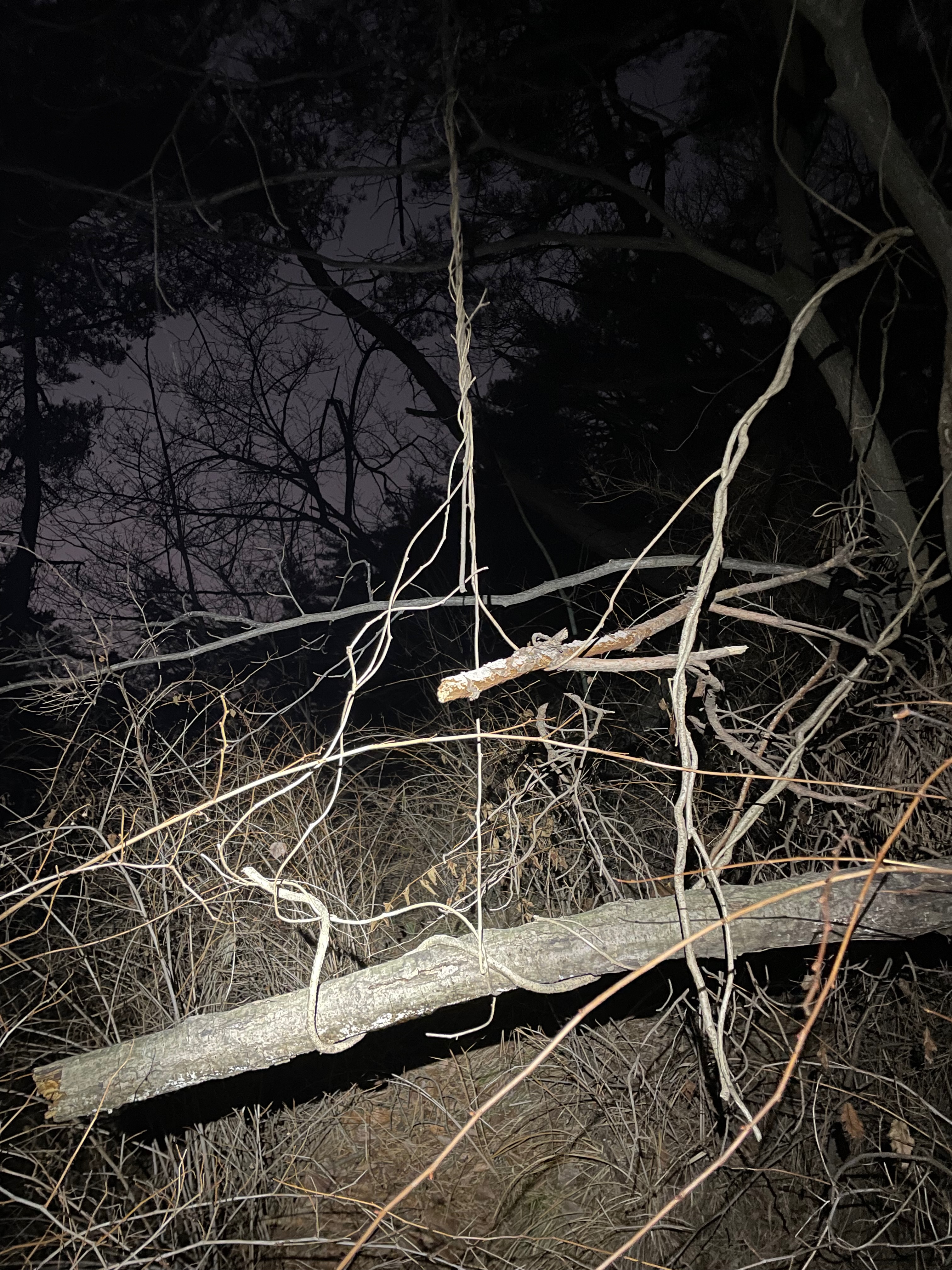 겨우 발견한 사람 발자취가 남은 길을 따라가는데 나뭇가지로 만든 이상한 문이 있다,,,, 밤에 봐서 그런가 더 무섭다,,, 기가 약해졌나보다,,,